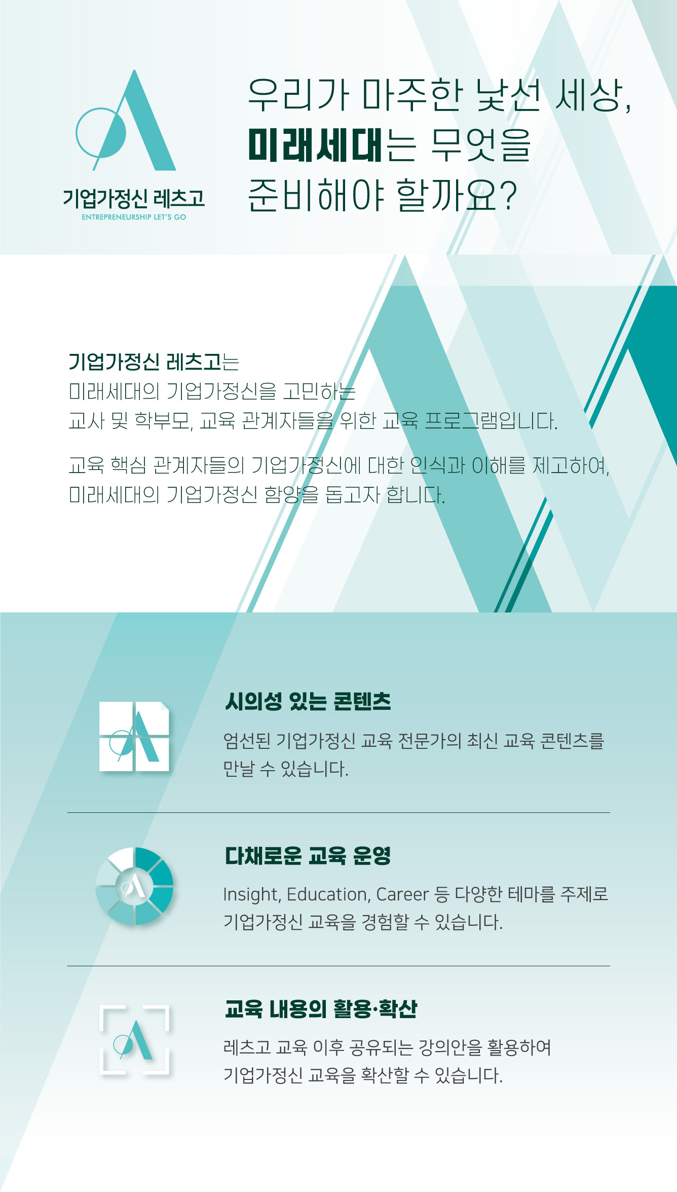 기업가정신 확산 프로그램의 교육 일정과 신청 안내, 관련 콘텐츠를 더욱 쉽고 빠르게 만나 보실 수 있습니다.